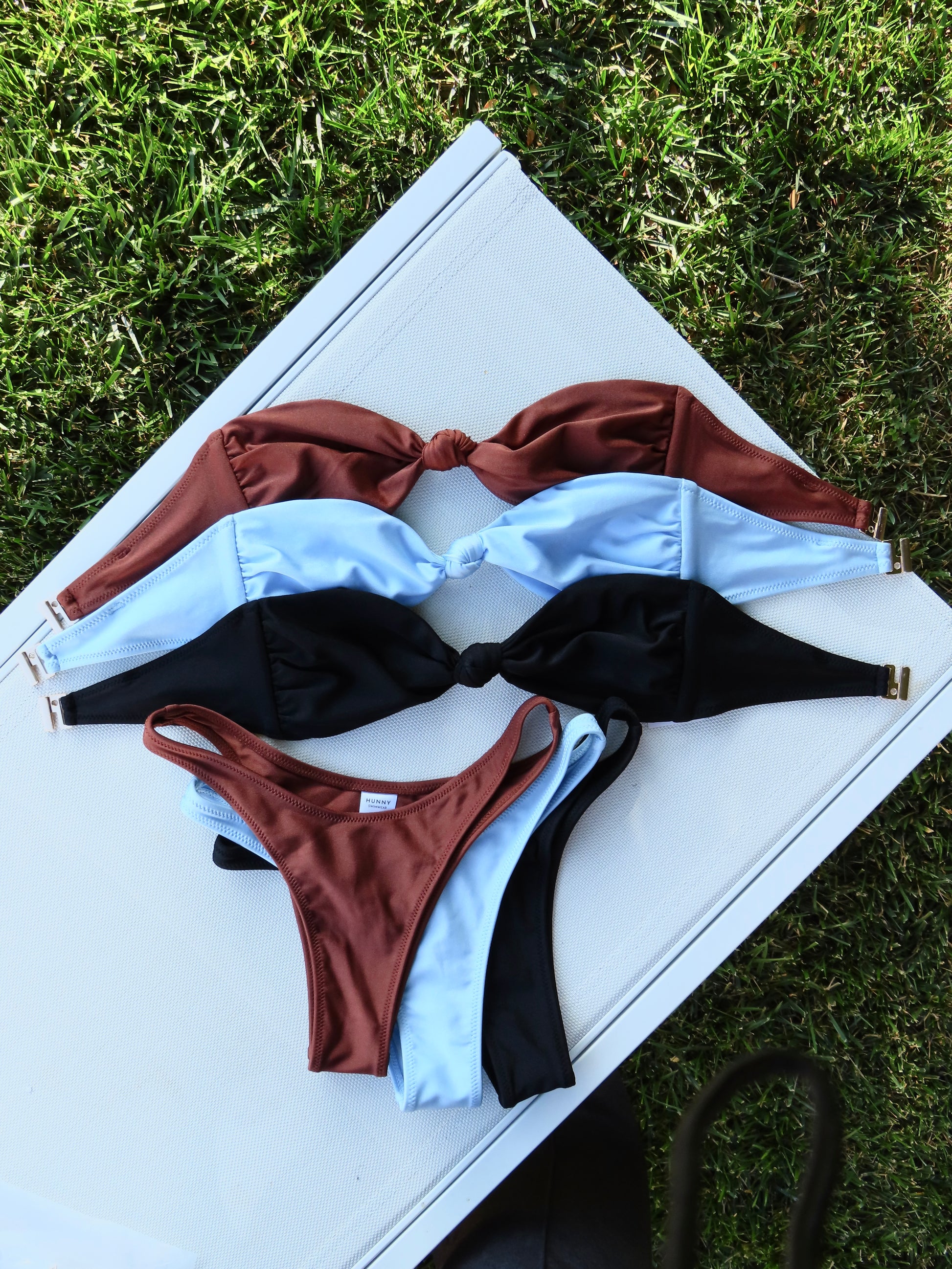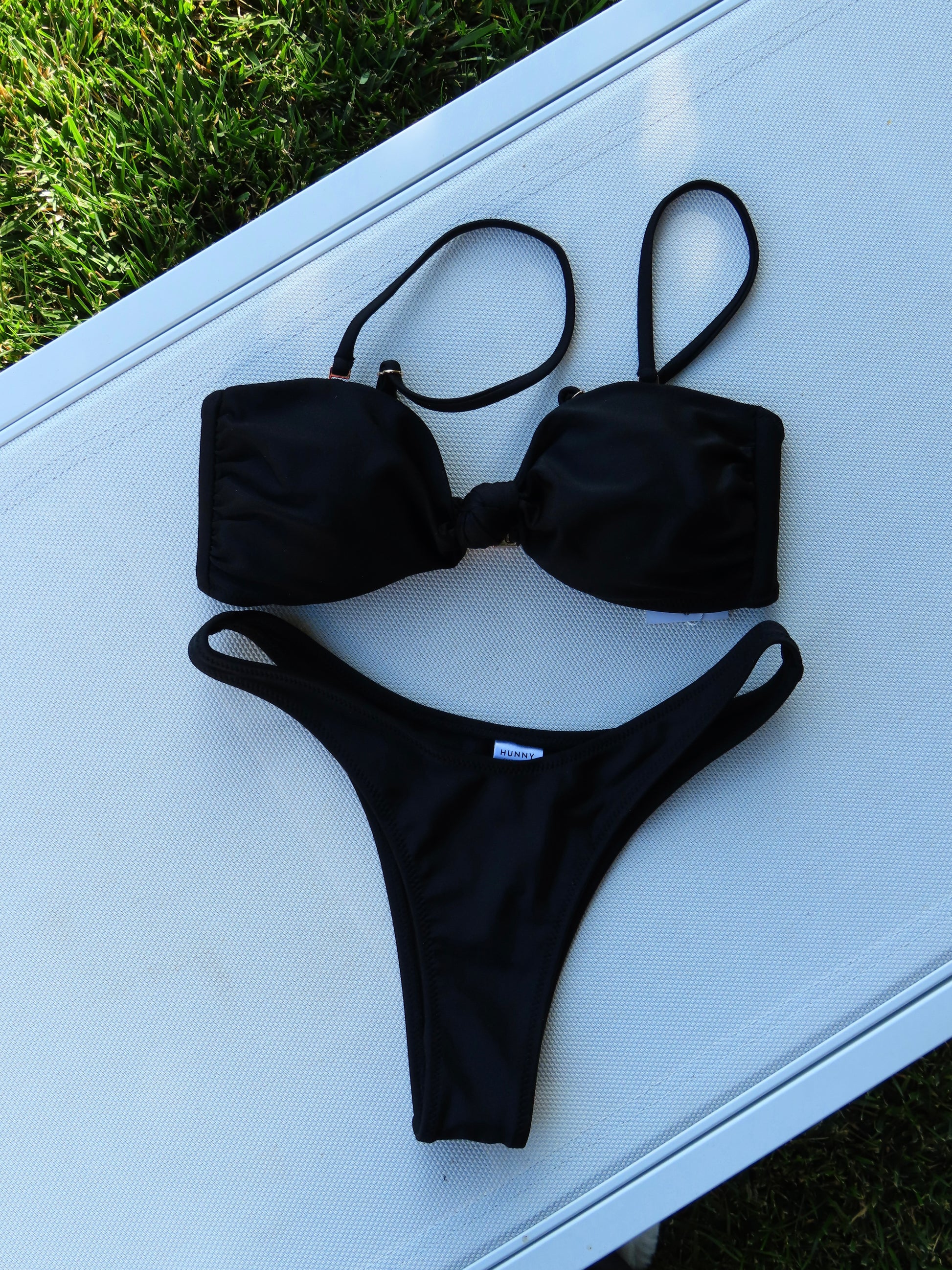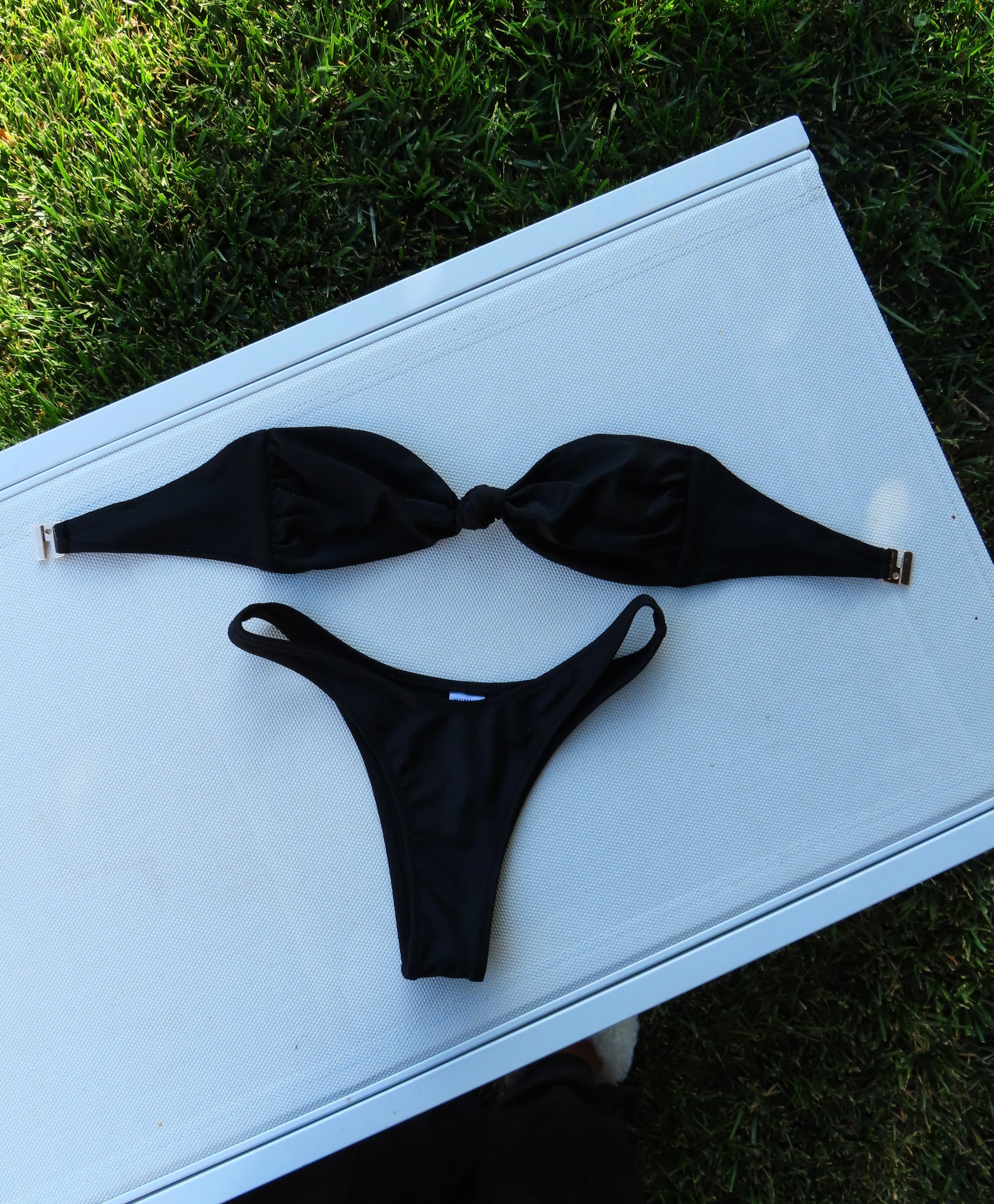 The classic black top is our padded bandeau top. Its flattering shape and tie knot is a great go-to for looking simple yet classy. It includes removable cups, removable straps and fastens with a gold metal clasp at the back.