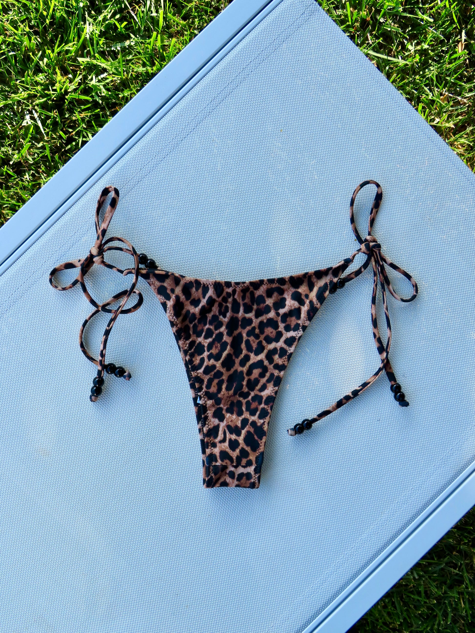 The leopard 2.0 bottom is our triple lined bikini bottom, designed to make you look and feel your best. These tie-sided triangle bikini bottoms are designed to sit high on the hips, enhancing leg length while offering cheeky to medium coverage. The side ties are elevated with shiny black beads.